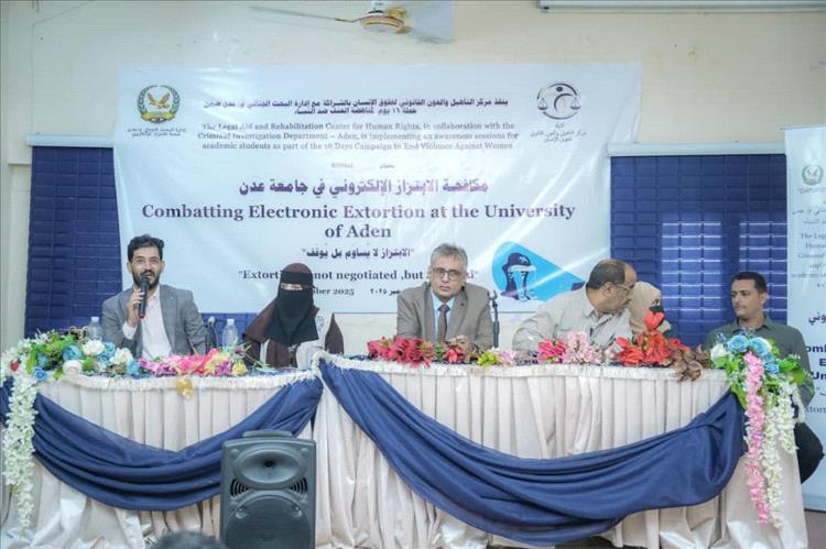 تحت شعار الابتزاز الإلكتروني لا يساوِم بل يوقف، نفذ مركز التأهيل والعون القانوني لحقوق الإنسان أولى محاضراته التوعوية حول مخاطر الابتزاز الإلكتروني، بالشراكة مع إدارة البحث الجنائي وجامعة عدن، ضمن حملة 16 يومًا لمناهضة العنف ضد النساء، التي انطلقت من كلية الآداب وستشمل بقية كليات الجامعة.